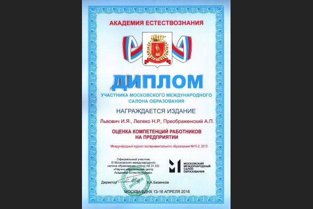 В рамках реализации данного решения научная статья «Оценка компетенций работников на предприятии» (опубликованная в журнале «Международный журнал экспериментального образования», авторы И.Я. Львович, Н.Р. Лелеко, А.П. Преображенский) была отобрана для представления и обсуждения на Московском международном салоне образования 2016, проходившем на ВДНХ 13-16 апреля 2016 г.